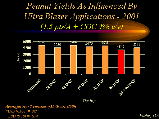 Peanut Yields As Influenced By Ultra Blazer Applications - 2001(1.5 pts/A + COC 1% v/v)<BR>Averaged over 2 varieties (GA Green, C99R)