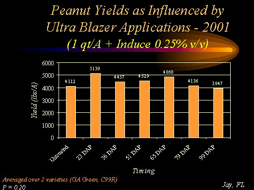 Peanut Yields as Influenced by Ultra Blazer Applications - 2001 (1 qt/A + Induce 0.25% v/v)<BR>Averaged over 2 varieties (GA Green, C99R)