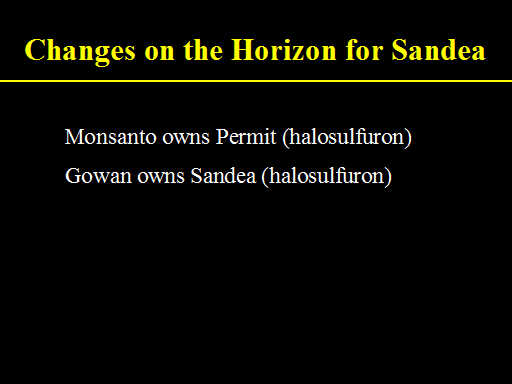 Changes on the Horizon for Sandea<BR>Monsanto owns Permit (halosulfuron) <BR>Gowan owns Sandea (halosulfuron) <BR> <BR>