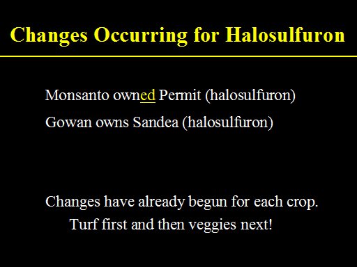 Changes Occurring for Halosulfuron<BR>Monsanto owned Permit (halosulfuron) <BR>Gowan owns Sandea (halosulfuron) <BR> <BR> <BR>Changes have already begun for each crop.  Turf first and then veggies next! <BR>