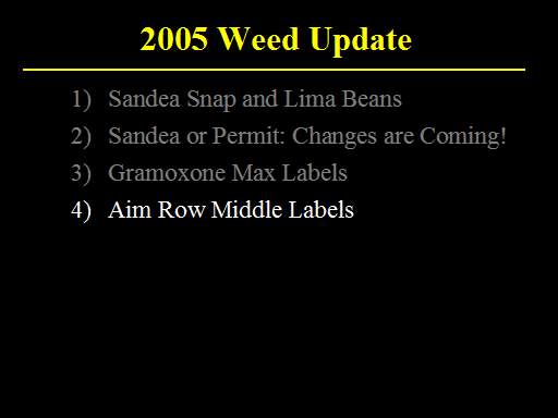 2005 Weed Update<BR>Sandea Snap and Lima Beans <BR>Sandea or Permit: Changes are Coming! <BR>Gramoxone Max Labels <BR>Aim Row Middle Labels<BR>