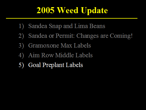 2005 Weed Update<BR>Sandea Snap and Lima Beans <BR>Sandea or Permit: Changes are Coming! <BR>Gramoxone Max Labels <BR>Aim Row Middle Labels <BR>Goal Preplant Labels<BR>