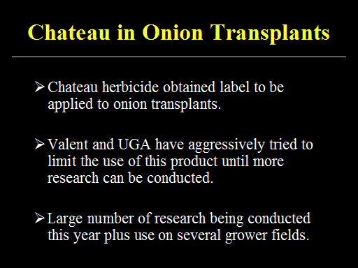 Chateau herbicide obtained label to be applied to onion transplants. <BR> <BR>Valent and UGA have aggressively tried to limit the use of this product until more research can be conducted. <BR> <BR>Large number of research being conducted this year plus use on several grower fields.<BR>Chateau in Onion Transplants<BR>