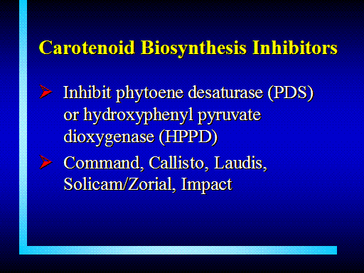 Carotenoid Biosynthesis Inhibitors<BR>Inhibit phytoene desaturase (PDS) or hydroxyphenyl pyruvate dioxygenase (HPPD) <BR>Command, Callisto, Laudis, Solicam/Zorial, Impact<BR>