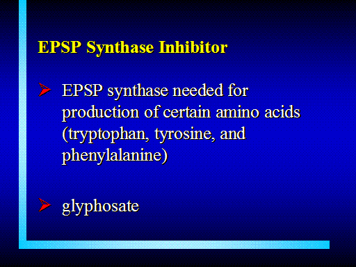 EPSP Synthase Inhibitor<BR>EPSP synthase needed for production of certain amino acids (tryptophan, tyrosine, and phenylalanine) <BR> <BR>glyphosate<BR>