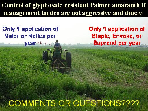 Control of glyphosate-resistant Palmer amaranth if management tactics are not aggressive and timely!<BR>Only 1 application of Valor or Reflex per year<BR>Only 1 application of Staple, Envoke, or Suprend per year<BR>COMMENTS OR QUESTIONS????<BR>