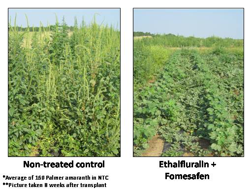Non-treated control<BR>Ethalfluralin + <BR>Fomesafen<BR>*Average of 160 Palmer amaranth in NTC <BR>**Picture taken 8 weeks after transplant <BR>