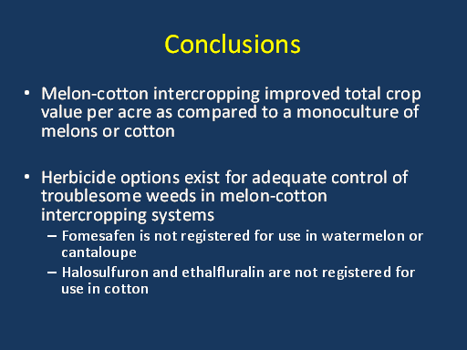 Conclusions<BR>Melon-cotton intercropping improved total crop value per acre as compared to a monoculture of melons or cotton  <BR> <BR>Herbicide options exist for adequate control of troublesome weeds in melon-cotton intercropping systems <BR>Fomesafen is not registered for use in watermelon or cantaloupe <BR>Halosulfuron and ethalfluralin are not registered for use in cotton <BR>