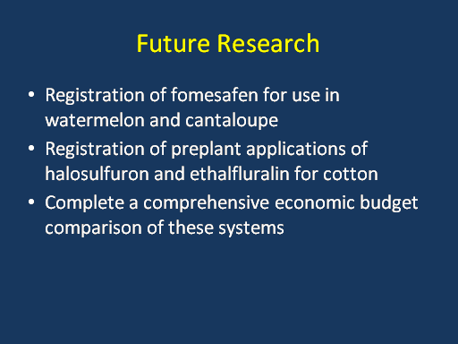 Future Research<BR>Registration of fomesafen for use in watermelon and cantaloupe <BR>Registration of preplant applications of halosulfuron and ethalfluralin for cotton <BR>Complete a comprehensive economic budget comparison of these systems<BR>