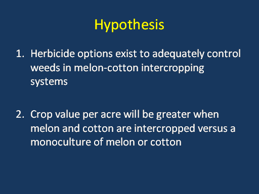 Hypothesis<BR>Herbicide options exist to adequately control weeds in melon-cotton intercropping systems <BR> <BR>Crop value per acre will be greater when melon and cotton are intercropped versus a monoculture of melon or cotton<BR>