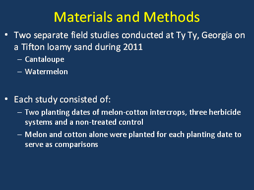 Materials and Methods<BR>Two separate field studies conducted at Ty Ty, Georgia on a Tifton loamy sand during 2011 <BR>Cantaloupe <BR>Watermelon <BR> <BR>Each study consisted of: <BR>Two planting dates of melon-cotton intercrops, three herbicide systems and a non-treated control <BR>Melon and cotton alone were planted for each planting date to serve as comparisons <BR> <BR> <BR> <BR> <BR> <BR> <BR>