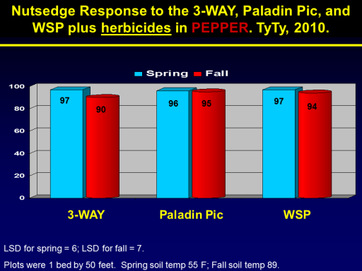 Nutsedge Response to the 3-WAY, Paladin Pic, and WSP plus herbicides in PEPPER. TyTy, 2010.<BR>LSD for spring = 6; LSD for fall = 7.  <BR>Plots were 1 bed by 50 feet.  Spring soil temp 55 F; Fall soil temp 89. <BR>97<BR>3-WAY<BR>Paladin Pic<BR>WSP<BR>96<BR>95<BR>94<BR>97<BR>90<BR>