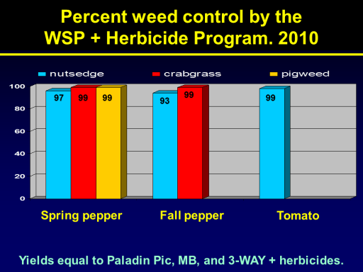 Percent weed control by the               WSP + Herbicide Program. 2010<BR>97<BR>Spring pepper<BR>Fall pepper<BR>Tomato<BR>93<BR>99<BR>99<BR>99<BR>99<BR>Yields equal to Paladin Pic, MB, and 3-WAY + herbicides.<BR>