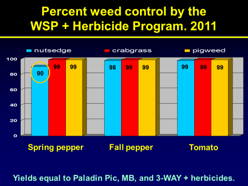 Percent weed control by the               WSP + Herbicide Program. 2011<BR>90<BR>Spring pepper<BR>Fall pepper<BR>Tomato<BR>98<BR>99<BR>99<BR>99<BR>99<BR>Yields equal to Paladin Pic, MB, and 3-WAY + herbicides.<BR>99<BR>99<BR>99<BR>