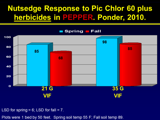 Nutsedge Response to Pic Chlor 60 plus herbicides in PEPPER. Ponder, 2010.<BR>LSD for spring = 6; LSD for fall = 7.  <BR>Plots were 1 bed by 50 feet.  Spring soil temp 55 F; Fall soil temp 89. <BR>21 G <BR>VIF<BR>35 G <BR>VIF<BR>85<BR>68<BR>85 <BR>98<BR>