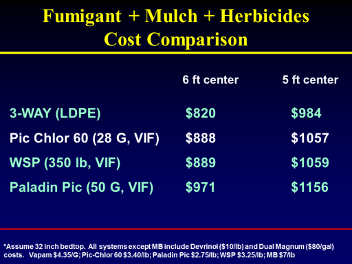 Fumigant + Mulch + Herbicides        Cost Comparison<BR>	<BR>3-WAY (LDPE) 			$820			$984 <BR>Pic Chlor 60 (28 G, VIF) 	$888			$1057 <BR>WSP (350 lb, VIF)		$889			$1059 <BR>Paladin Pic (50 G, VIF)	$971			$1156 <BR>*Assume 32 inch bedtop.  All systems except MB include Devrinol ($10/lb) and Dual Magnum ($80/gal) costs.   Vapam $4.35/G; Pic-Chlor 60 $3.40/lb; Paladin Pic $2.75/lb; WSP $3.25/lb; MB $7/lb<BR>6 ft center<BR>5 ft center<BR>