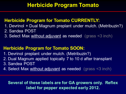 Herbicide Program Tomato<BR>Herbicide Program for Tomato SOON:   1. Devrinol preplant under mulch. (Metribuzin?) 2. Dual Magnum applied topically 7 to 10 d after transplant  3. Sandea POST  4. Select Max without adjuvant as needed  (grass <3 inch) <BR>Herbicide Program for Tomato CURRENTLY:   1. Devrinol + Dual Magnum preplant under mulch. (Metribuzin?) 2. Sandea POST  3. Select Max without adjuvant as needed  (grass <3 inch) <BR>Several of these labels are for GA growers only.  Reflex label for pepper expected early 2012.<BR>