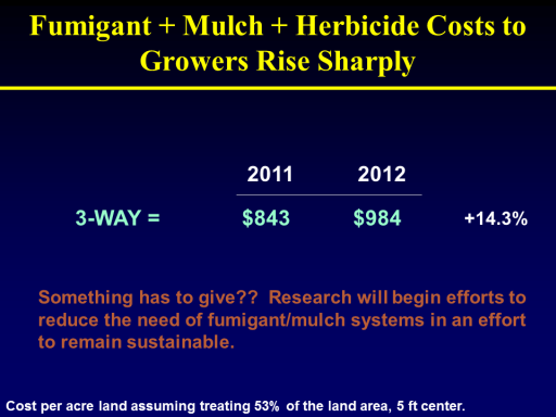 Fumigant + Mulch + Herbicide Costs to Growers Rise Sharply<BR>	<BR> <BR>3-WAY =		$843		$984 <BR>		<BR>Cost per acre land assuming treating 53% of the land area, 5 ft center.<BR>2011<BR>2012<BR>+14.3%<BR>Something has to give??  Research will begin efforts to reduce the need of fumigant/mulch systems in an effort to remain sustainable.<BR>