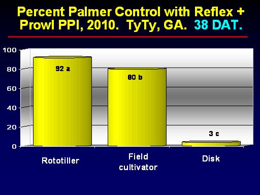 80 b<BR>92 a<BR>3 c<BR>Rototiller<BR>Field cultivator<BR>Disk<BR>Percent Palmer Control with Reflex + Prowl PPI, 2010.  TyTy, GA.  38 DAT. <BR>