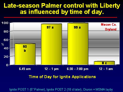 99 a<BR>50 b<BR>97 a<BR>6.45 am<BR>8 c<BR>Ignite POST 1 (5” Palmer), Ignite POST 2 (18 d later), Diuron + MSMA layby<BR>12 – 1 pm <BR>6:30 – 7:00 pm<BR>12 – 1 am<BR>Late-season Palmer control with Liberty as influenced by time of day. <BR>Time of Day for Ignite Applications<BR>Macon Co. <BR>Dryland<BR>%<BR>