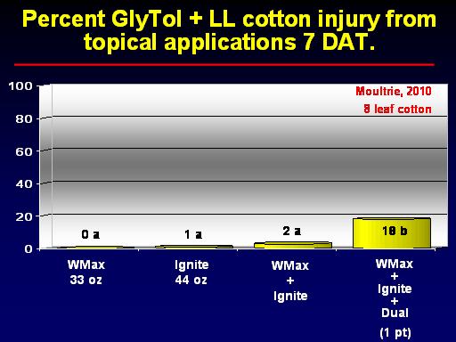 WMax + Ignite<BR>WMax 33 oz<BR>Ignite 44 oz<BR>WMax + Ignite +   Dual <BR>(1 pt)<BR>Percent GlyTol + LL cotton injury from topical applications 7 DAT. <BR>Moultrie, 2010 <BR>8 leaf cotton<BR>0 a<BR>2 a<BR>1 a<BR>18 b<BR>