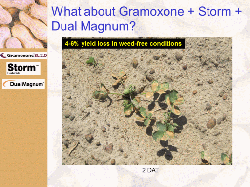 What about Gramoxone + Storm + Dual Magnum?<BR>2 DAT<BR>4-6% yield loss in weed-free conditions<BR>