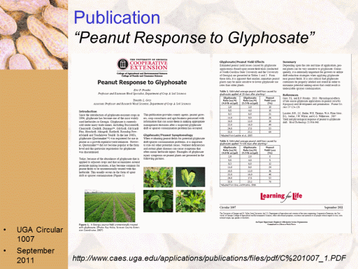 Publication “Peanut Response to Glyphosate”<BR>UGA Circular 1007 <BR>September 2011<BR>http://www.caes.uga.edu/applications/publications/files/pdf/C%201007_1.PDF<BR>