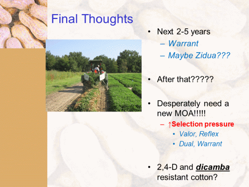 Final Thoughts<BR>Next 2-5 years <BR>Warrant <BR>Maybe Zidua??? <BR> <BR>After that????? <BR> <BR>Desperately need a new MOA!!!!! <BR>?Selection pressure <BR>Valor, Reflex <BR>Dual, Warrant <BR> <BR>2,4-D and dicamba resistant cotton?<BR>