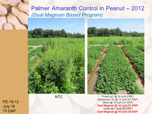 Palmer Amaranth Control in Peanut – 2012 (Dual Magnum Based Program)<BR>PE-18-12 <BR>July 18 <BR>75 DAP<BR>NTC<BR>Prowl H2O @ 34 oz/A (PRE) <BR>Gramoxone SL @ 12 oz/A (21 DAP) <BR>Storm @ 16 oz/A (21 DAP) <BR>Dual Magnum @ 16 oz/A (21 DAP) <BR>Cadre @ 4 oz/A (39 DAP) <BR>Dual Magnum @ 16 oz/A (39 DAP)<BR>