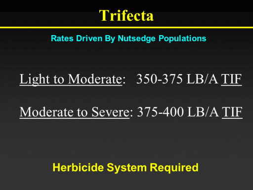 Trifecta<BR>Light to Moderate:   350-375 LB/A TIF <BR> <BR>Moderate to Severe: 375-400 LB/A TIF<BR>Herbicide System Required<BR>Rates Driven By Nutsedge Populations<BR>
