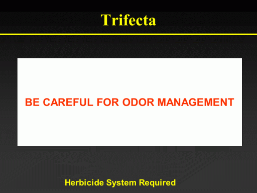 Trifecta<BR>Light Populations:  <BR>	40 GPA TIF <BR>Moderate to Severe: <BR>	50 GPA TIF<BR>Herbicide System Required<BR>BE CAREFUL FOR ODOR MANAGEMENT<BR>
