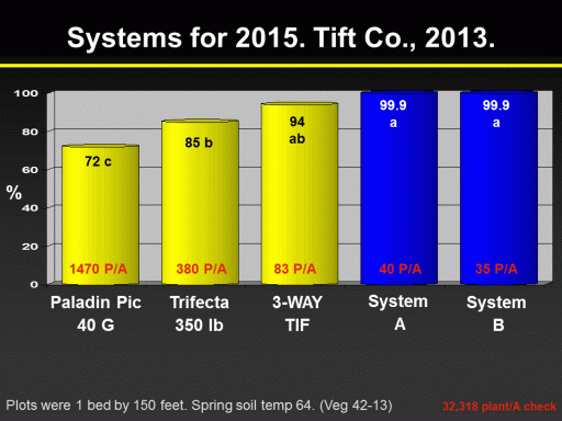 Systems for 2015. Tift Co., 2013. <BR>Plots were 1 bed by 150 feet. Spring soil temp 64. (Veg 42-13)<BR>Paladin Pic <BR>40 G<BR>3-WAY <BR>TIF<BR>System <BR> A<BR>85 b<BR>72 c<BR>99.9 a<BR>%<BR>40 P/A<BR>35 P/A<BR>1470 P/A<BR>32,318 plant/A check<BR>94ab<BR>Trifecta <BR>350 lb<BR>83 P/A<BR>System <BR> B<BR>99.9 a<BR>380 P/A<BR>