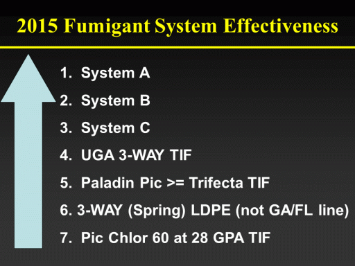 2015 Fumigant System Effectiveness <BR>1.  System A <BR>2.  System B <BR>3.  System C <BR>4.  UGA 3-WAY TIF  <BR>5.  Paladin Pic >= Trifecta TIF <BR>6. 3-WAY (Spring) LDPE (not GA/FL line) <BR>7.  Pic Chlor 60 at 28 GPA TIF<BR>