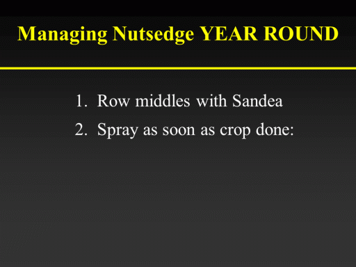 Managing Nutsedge YEAR ROUND<BR>1.  Row middles with Sandea <BR>2.  Spray as soon as crop done:    <BR>