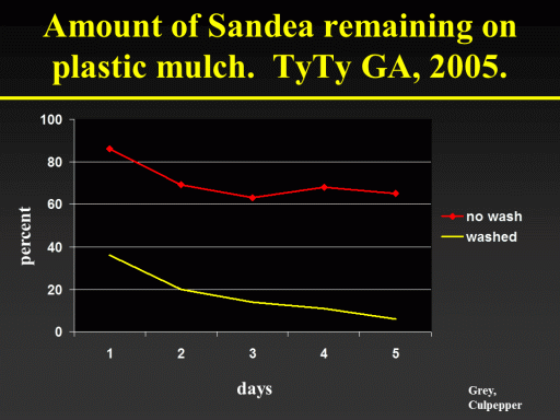 Amount of Sandea remaining on plastic mulch.  TyTy GA, 2005.<BR>percent<BR>days<BR>Grey, Culpepper<BR>