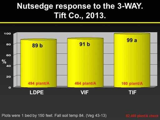 Nutsedge response to the 3-WAY.         Tift Co., 2013.<BR>Plots were 1 bed by 150 feet. Fall soil temp 84. (Veg 43-13)<BR>LDPE<BR>VIF<BR>TIF<BR>91 b<BR>89 b<BR>99 a<BR>%<BR>160 plant/A<BR>464 plant/A<BR>494 plant/A<BR>82,460 plant/A check<BR>