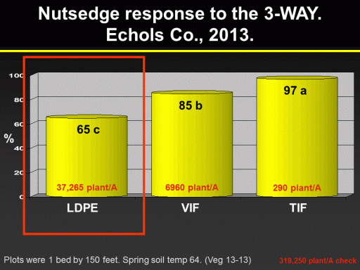 Nutsedge response to the 3-WAY.  Echols Co., 2013.<BR>Plots were 1 bed by 150 feet. Spring soil temp 64. (Veg 13-13)<BR>LDPE<BR>VIF<BR>TIF<BR>85 b<BR>65 c<BR>97 a<BR>%<BR>290 plant/A<BR>6960 plant/A<BR>37,265 plant/A<BR>319,250 plant/A check<BR>