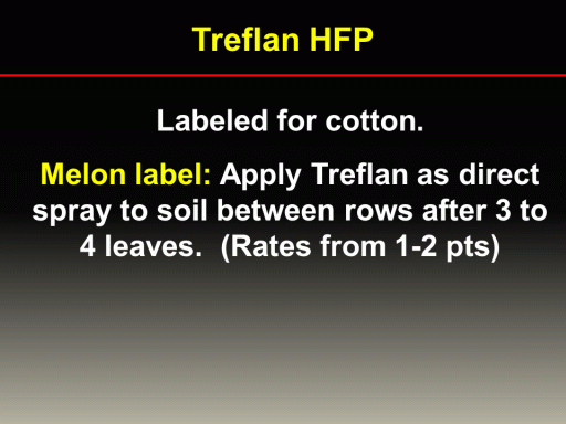Treflan HFP<BR>Labeled for cotton. <BR>Melon label: Apply Treflan as direct spray to soil between rows after 3 to 4 leaves.  (Rates from 1-2 pts)<BR>