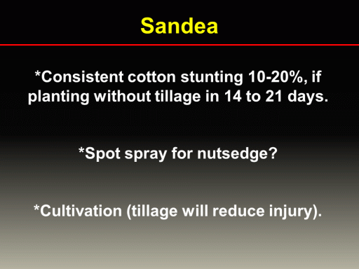 Sandea<BR>*Consistent cotton stunting 10-20%, if planting without tillage in 14 to 21 days. <BR> <BR>*Spot spray for nutsedge? <BR> <BR>*Cultivation (tillage will reduce injury).<BR>