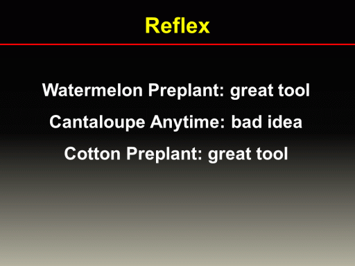 Reflex<BR>Watermelon Preplant: great tool <BR>Cantaloupe Anytime: bad idea <BR>Cotton Preplant: great tool <BR>