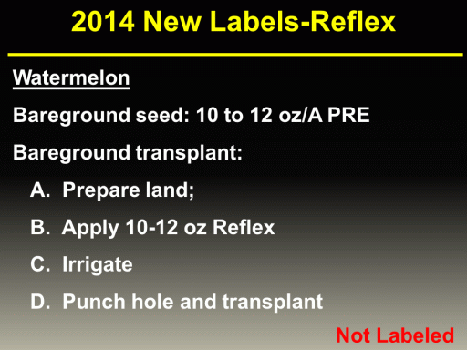 2014 New Labels-Reflex <BR>Watermelon <BR>Bareground seed: 10 to 12 oz/A PRE <BR>Bareground transplant: <BR>	A.  Prepare land;  <BR>	B.  Apply 10-12 oz Reflex <BR>	C.  Irrigate <BR>	D.  Punch hole and transplant<BR>Not Labeled<BR>