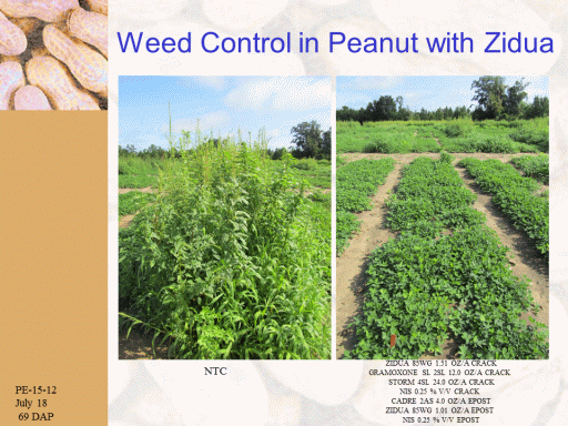 Weed Control in Peanut with Zidua <BR>PE-15-12 <BR>July 18 <BR> 69 DAP<BR>NTC<BR>ZIDUA 85WG 1.51 OZ/A CRACK <BR>GRAMOXONE SL 2SL 12.0 OZ/A CRACK  <BR>STORM 4SL 24.0 OZ/A CRACK <BR>NIS 0.25 % V/V CRACK  <BR>CADRE 2AS 4.0 OZ/A EPOST <BR>ZIDUA 85WG 1.01 OZ/A EPOST  <BR>NIS 0.25 % V/V EPOST<BR>