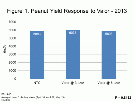 Figure 1. Peanut Yield Response to Valor - 2013<BR>PE-14-13 <BR>Averaged over 3 planting dates (April 16, April 29, May 13) <BR>GA-06G<BR>P = 0.8162<BR>lbs/A<BR>