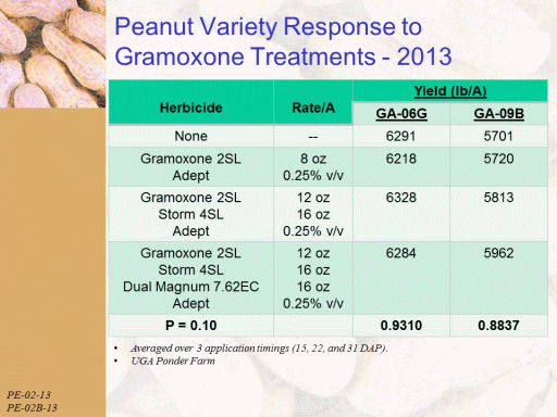 Peanut Variety Response to Gramoxone Treatments - 2013<BR>PE-02-13 <BR>PE-02B-13<BR>Averaged over 3 application timings (15, 22, and 31 DAP). <BR>UGA Ponder Farm<BR>