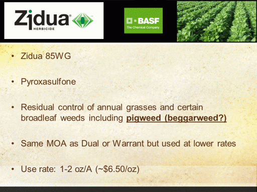Zidua 85WG <BR> <BR>Pyroxasulfone <BR> <BR>Residual control of annual grasses and certain broadleaf weeds including pigweed (beggarweed?) <BR> <BR>Same MOA as Dual or Warrant but used at lower rates <BR> <BR>Use rate: 1-2 oz/A (~$6.50/oz)<BR>
