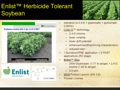 Enlist™ Herbicide Tolerant Soybean<BR>tolerance to 2,4-D + glyphosate + glufosinate (Liberty) <BR>Colex-D™ technology <BR>2,4-D choline <BR>lower volatility <BR>lower drift potential <BR>enhanced handling/mixing characteristics <BR>reduced odor <BR>1 Burndown/PRE application + 2 POST applications (R2 stage) <BR>Enlist™ Duo <BR>DMA-Glyphosate (1.71 lb ae/gal) + 2,4-D choline (1.63 lb ae/gal) <BR>3.5 pt/A <BR>2015 Product Launch (MG 3.8) <BR>Pioneer License<BR>2,4-D choline<BR>