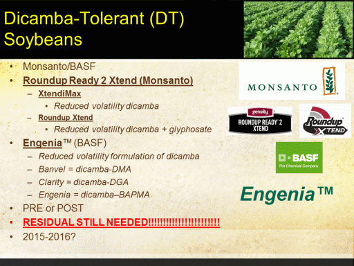 Dicamba-Tolerant (DT) Soybeans<BR>Monsanto/BASF <BR>Roundup Ready 2 Xtend (Monsanto) <BR>XtendiMax <BR>Reduced volatility dicamba <BR>Roundup Xtend <BR>Reduced volatility dicamba + glyphosate <BR>Engenia™ (BASF) <BR>Reduced volatility formulation of dicamba <BR>Banvel = dicamba-DMA <BR>Clarity = dicamba-DGA <BR>Engenia = dicamba–BAPMA <BR>PRE or POST <BR>RESIDUAL STILL NEEDED!!!!!!!!!!!!!!!!!!!!!!! <BR>2015-2016?<BR>Engenia™<BR>