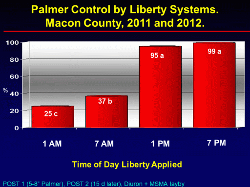95 a<BR>25 c<BR>37 b<BR>99 a<BR>Palmer Control by Liberty Systems.                 Macon County, 2011 and 2012.<BR>Time of Day Liberty Applied <BR>%<BR>7 PM<BR>POST 1 (5-8” Palmer), POST 2 (15 d later), Diuron + MSMA layby<BR>1 PM<BR>7 AM<BR>1 AM<BR>