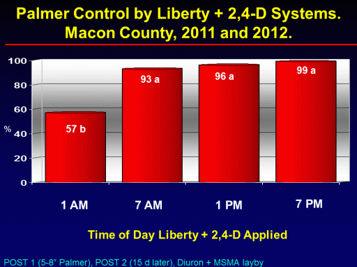 96 a<BR>57 b<BR>93 a<BR>99 a<BR>Palmer Control by Liberty + 2,4-D Systems.                 Macon County, 2011 and 2012.<BR>Time of Day Liberty + 2,4-D Applied <BR>%<BR>7 PM<BR>POST 1 (5-8” Palmer), POST 2 (15 d later), Diuron + MSMA layby<BR>1 PM<BR>7 AM<BR>1 AM<BR>