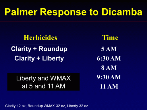 Palmer Response to Dicamba<BR>Clarity + Roundup <BR>Clarity + Liberty <BR>Herbicides <BR>5 AM <BR>6:30 AM <BR>8 AM <BR>9:30 AM <BR>11 AM <BR>Time <BR>Clarity 12 oz; Roundup WMAX 32 oz, Liberty 32 oz<BR>Liberty and WMAX  <BR>at 5 and 11 AM<BR>